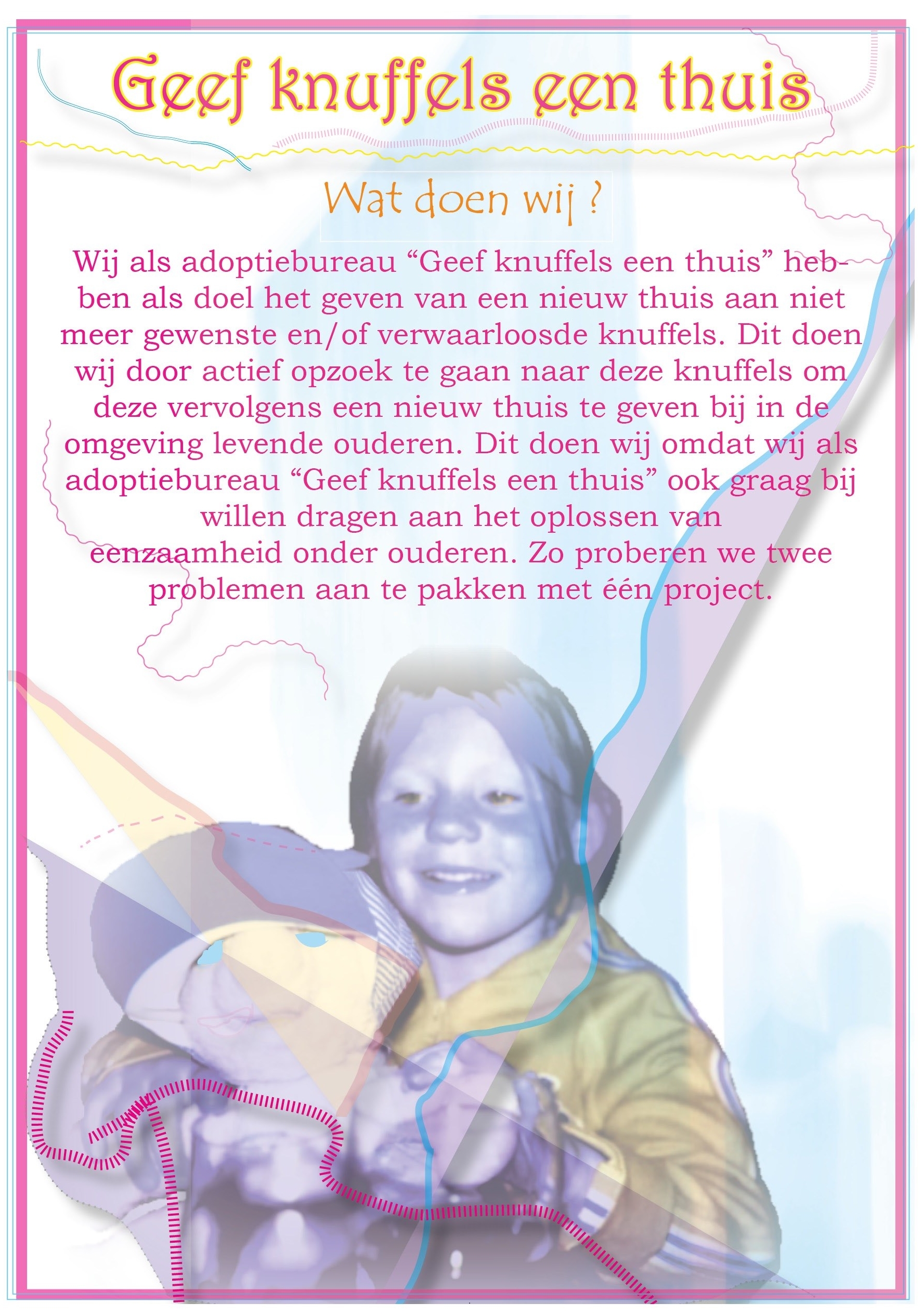 Geef knuffels een thuis With the project “Geef knuffels een thuis” I have tried to give neglected stuffed animals a new home with elderly people. Dit delen: Delen op X (Opent in een nieuw venster) X Share op Facebook (Opent in een nieuw venster) Facebook Vind-ik-leuk Aan het laden...